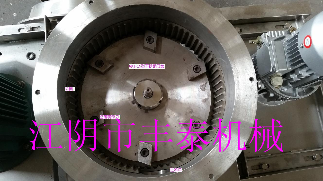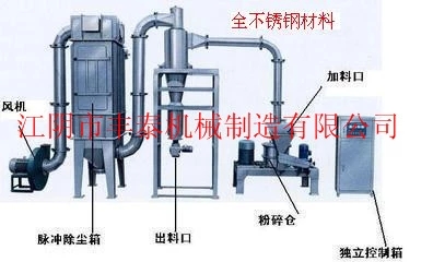 物料由料斗經螺旋輸送器進入粉碎室,被高速旋轉的刀片剪切粉碎,通過負壓風運的方法把物料運入旋風分離器、袋式除塵器,排除物料達到產品的要求。